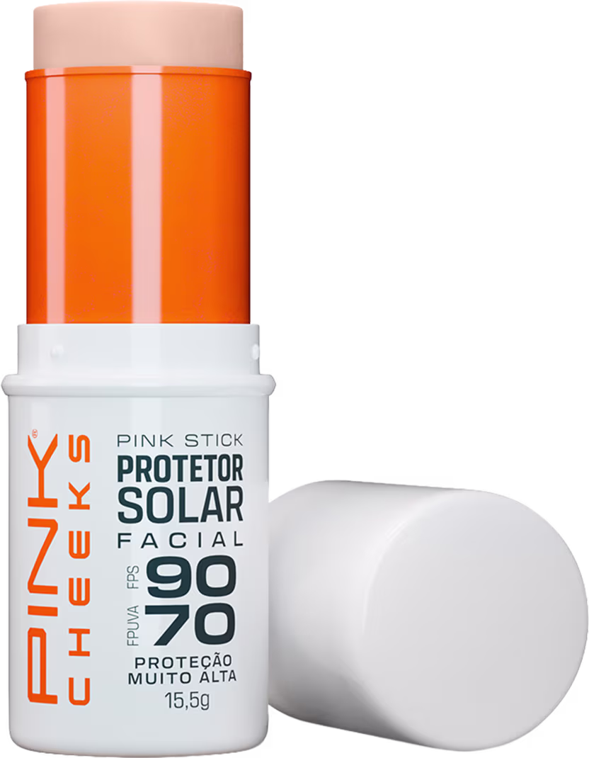 Protetor solar facial com cor em bastão. Pink Cheeks Pink Stick FPS 90 é prático e multifuncional, ideal para ser usado como um protetor solar diário e, especialmente, durante a prática de exercícios físicos ao ar livre, já que é resistente à água e ao suor.