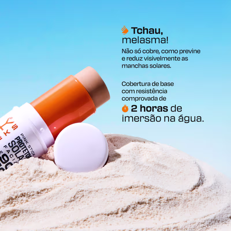 Protetor solar facial com cor em bastão. Pink Cheeks Pink Stick FPS 90 é prático e multifuncional, ideal para ser usado como um protetor solar diário e, especialmente, durante a prática de exercícios físicos ao ar livre, já que é resistente à água e ao suor.