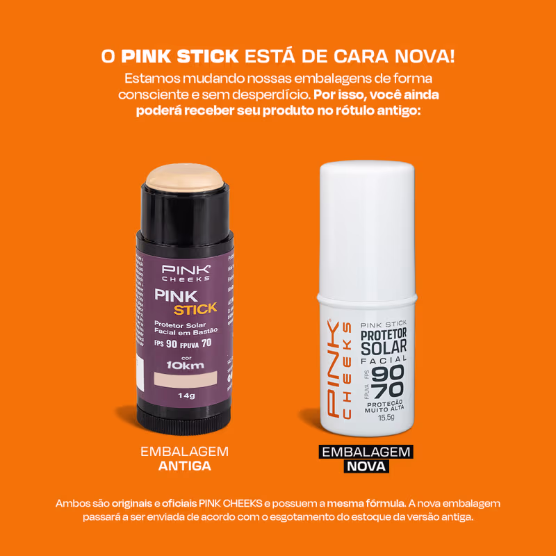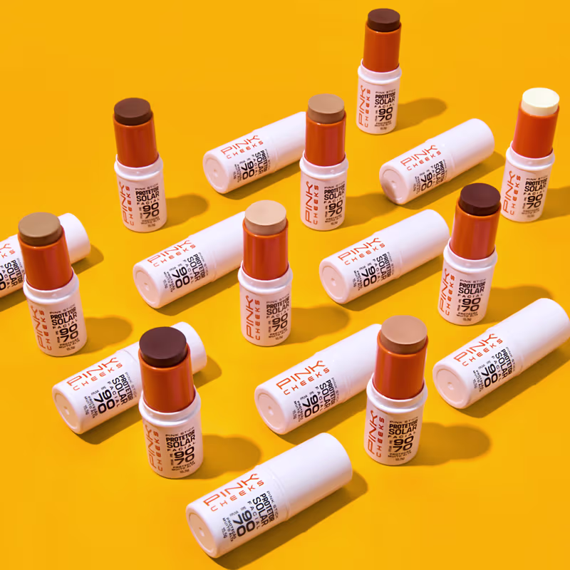 - ▸Protetor solar Pink Cheeks com cor em bastão e FPS 90, prático e multifuncional;