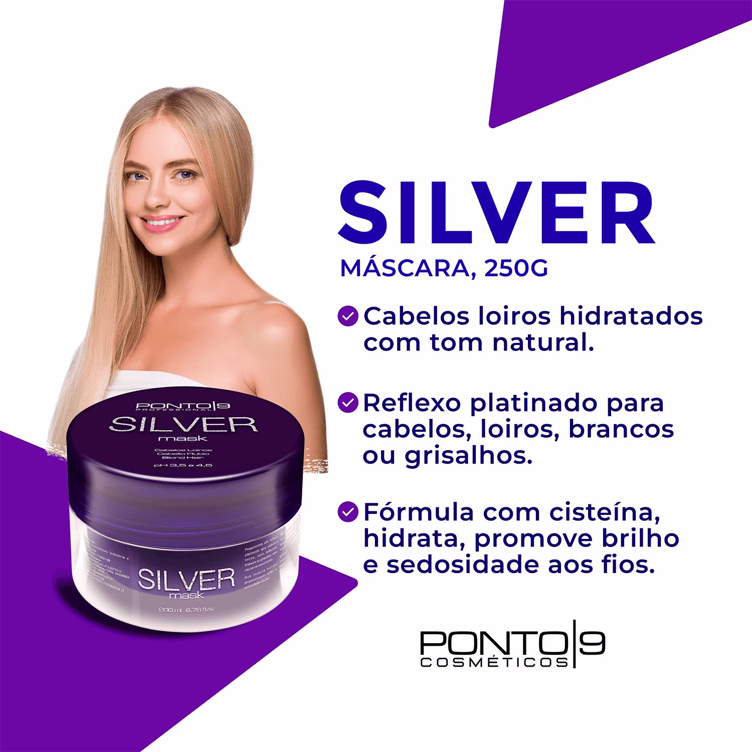Não sei o CEPMáscara hidratante para cabelo loiros, brancos e grisalhos. Ponto 9 Silver promove um tratamento intenso que garante fios platinados, sem ressecamento.