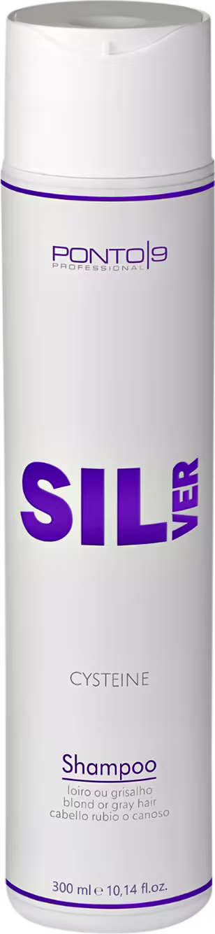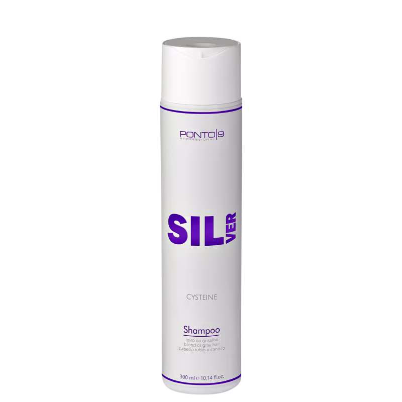 Shampoo para cabelos loiros, brancos ou grisalhos. Ponto 9 Silver limpa os fios e garante um efeito platinado sem ressecar o cabelo.