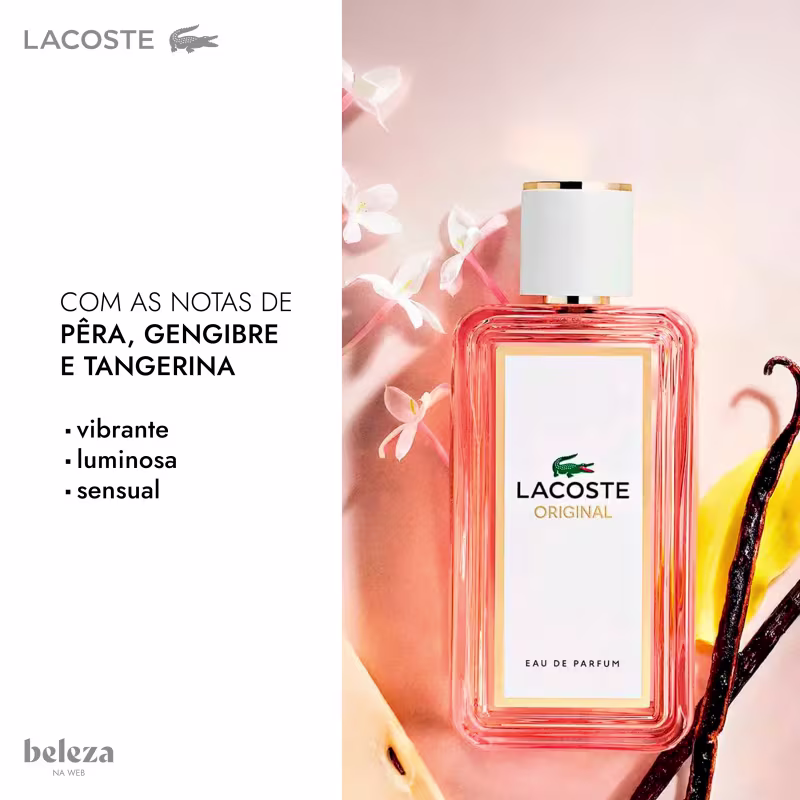 O Perfume Pour Femme, de Lacoste, abre com um trio vibrante de pera suculenta, gengibre e tangerina, evoluindo para um coração floral luminoso marcado por jasmim, rosa eterna e um acorde solar radiante. O fundo revela um rastro sensual e acolhedor, combinando baunilha cremosa e âmbar. O frasco, alongado e moderno, surge em rosa vibrante com detalhes dourados que expressam a ousadia e a sofisticação da mulher Lacoste.