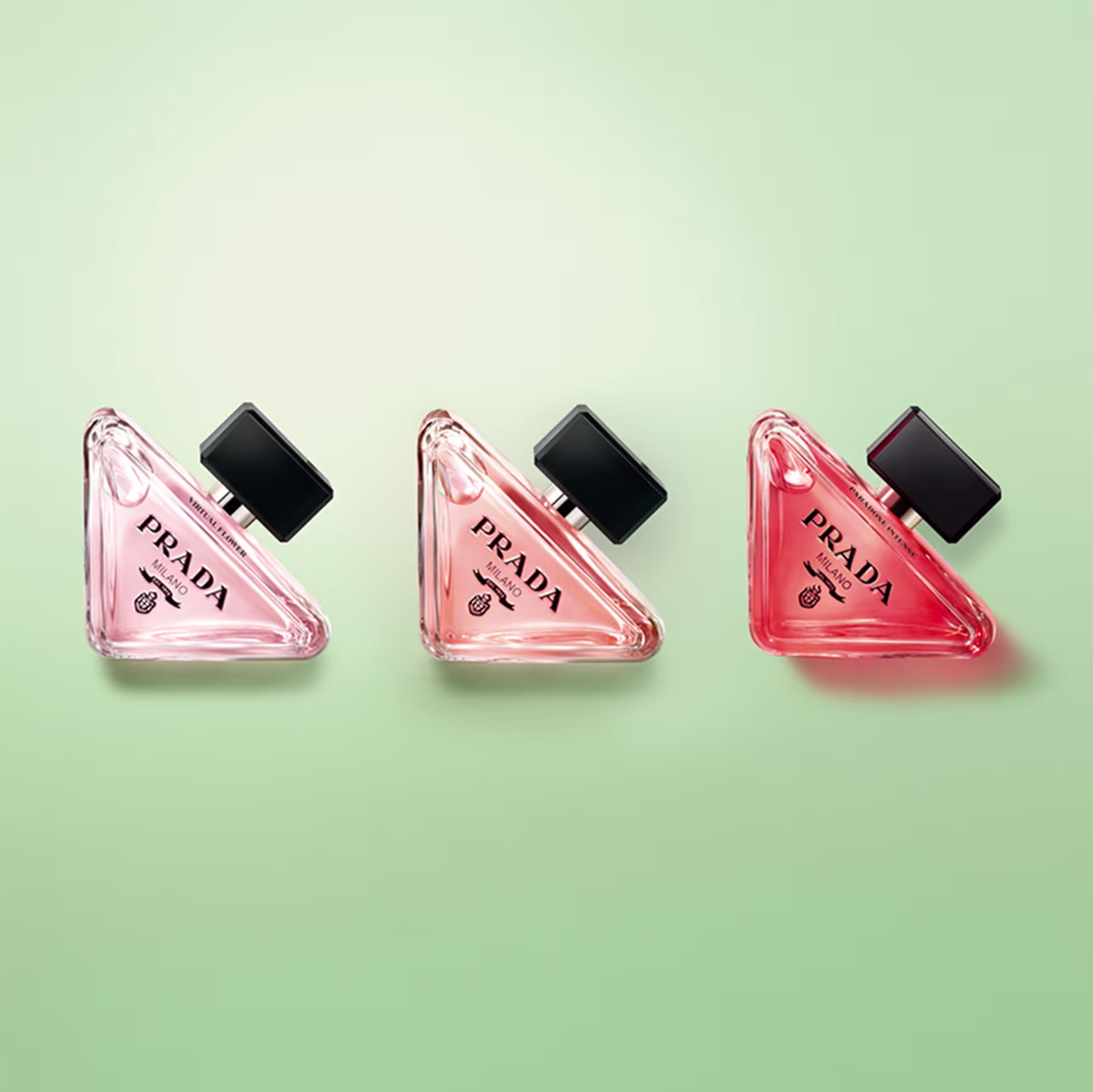 O frasco reflete o símbolo mais icônico da Prada: o triângulo. Inclinado e imponente, o design disruptivo combina o tom rosa coral da fragrância com o preto profundo da tampa e o brasão dourado da marca, expressando o equilíbrio entre feminilidade e ousadia.