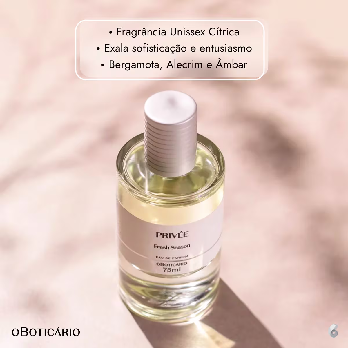 O Eau de Parfum Privée Fresh Season, o Boticário, é uma fragrância exclusiva e inusitada da perfumaria de luxo. Sofisticado com acorde cítrico, fresco, e energizante.
