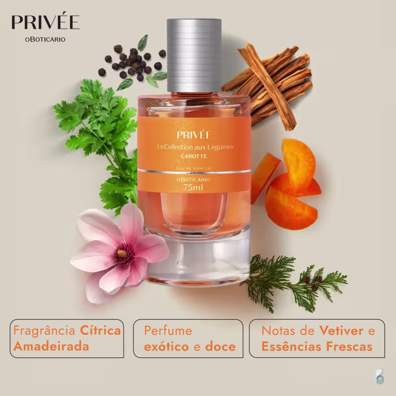 Privée O Boticário,, linha que traz as maiores tendências olfativas da perfumaria internacional, apresenta Privée La Collection Aux Légumes Carotte Eau De Parfum, criado com a sinestesia exótica do olfativo e o aspecto textural dos legumes em uma fragrância cítrica amadeirada com Carotte: a doçura da cenoura com notas cítricas e amadeiradas.