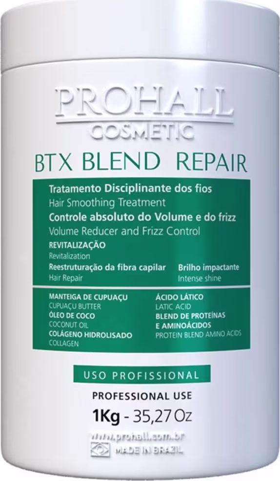Tratamento disciplinante para cabelos danificados. Prohall Cosmetic Btx Blend Repair proporciona fios alinhados por mais tempo.