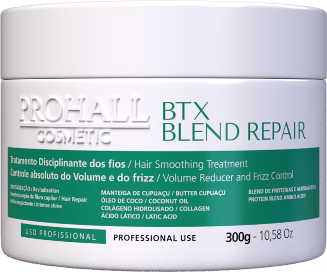 Tratamento disciplinante para cabelos danificados. Prohall Cosmetic Btx Blend Repair proporciona fios alinhados por mais tempo.