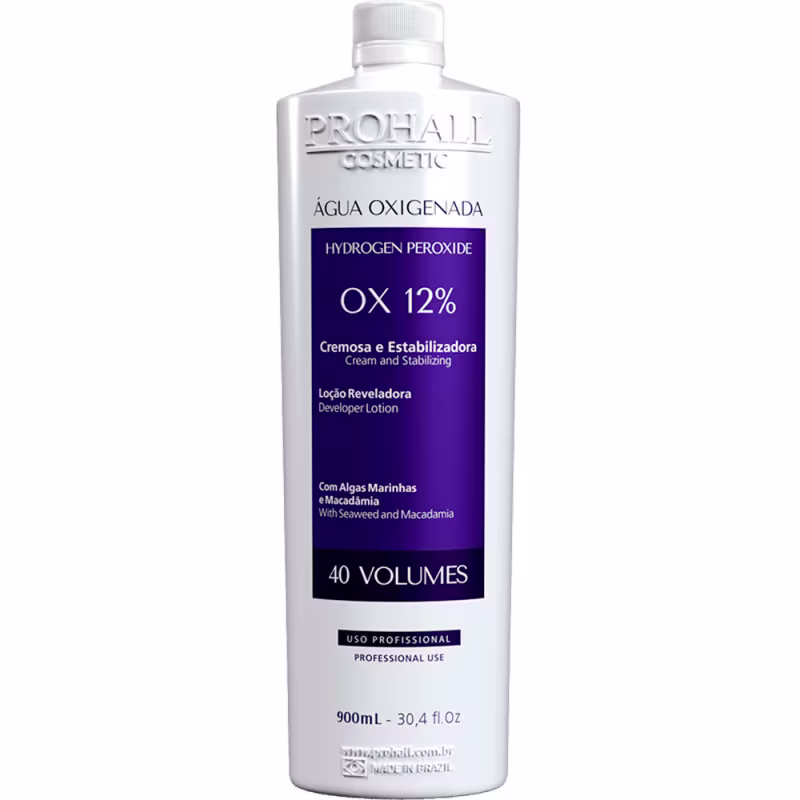 Água oxigenada de 40 volumes. Prohall Cosmetic OX 12% 40 Volumes auxilia no clareamento capilar e promove um cuidado extra à saúde dos fios.
