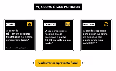 - Compre a partir de R$ 180 em produtos* NEUTROGENA® no mesmo comprovante fiscal.