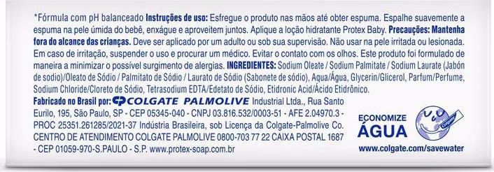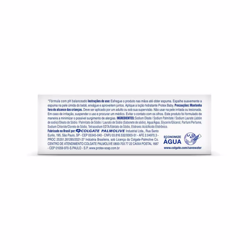 Não sei o CEPSabonete em barra com ação antibacteriana para peles infantis. Protex Baby possui fórmula leve e delicada.