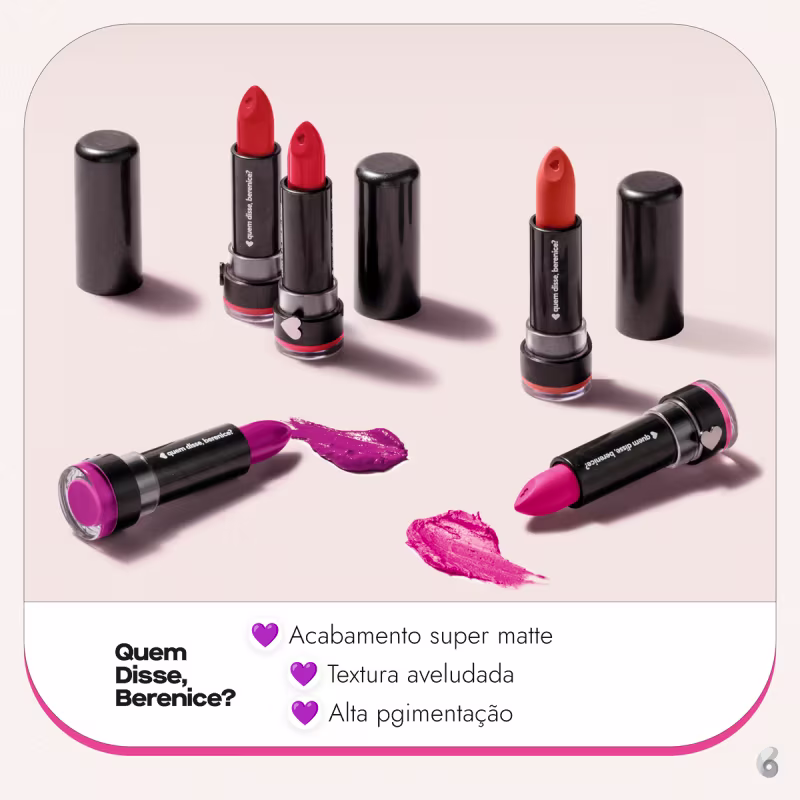O Batom Quem Disse, Berenice? Alta Pigmentação traz mais intensidade para seus looks com lábios coloridos, marcantes e aveludados. Sequinho, mas super confortável, proporciona uma cobertura completa, que dispensa retoques.