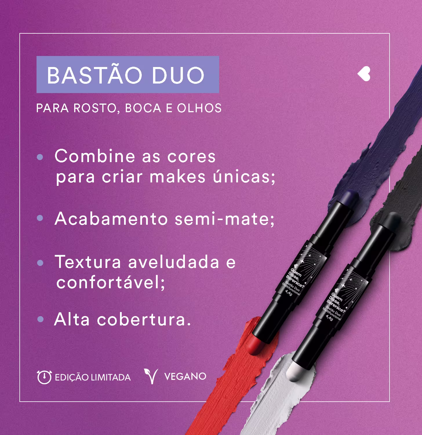 Bastão duo multifuncional, Versátil, Quem disse, Berenice? pode ser usado na boca, na face, nos olhos e no corpo.