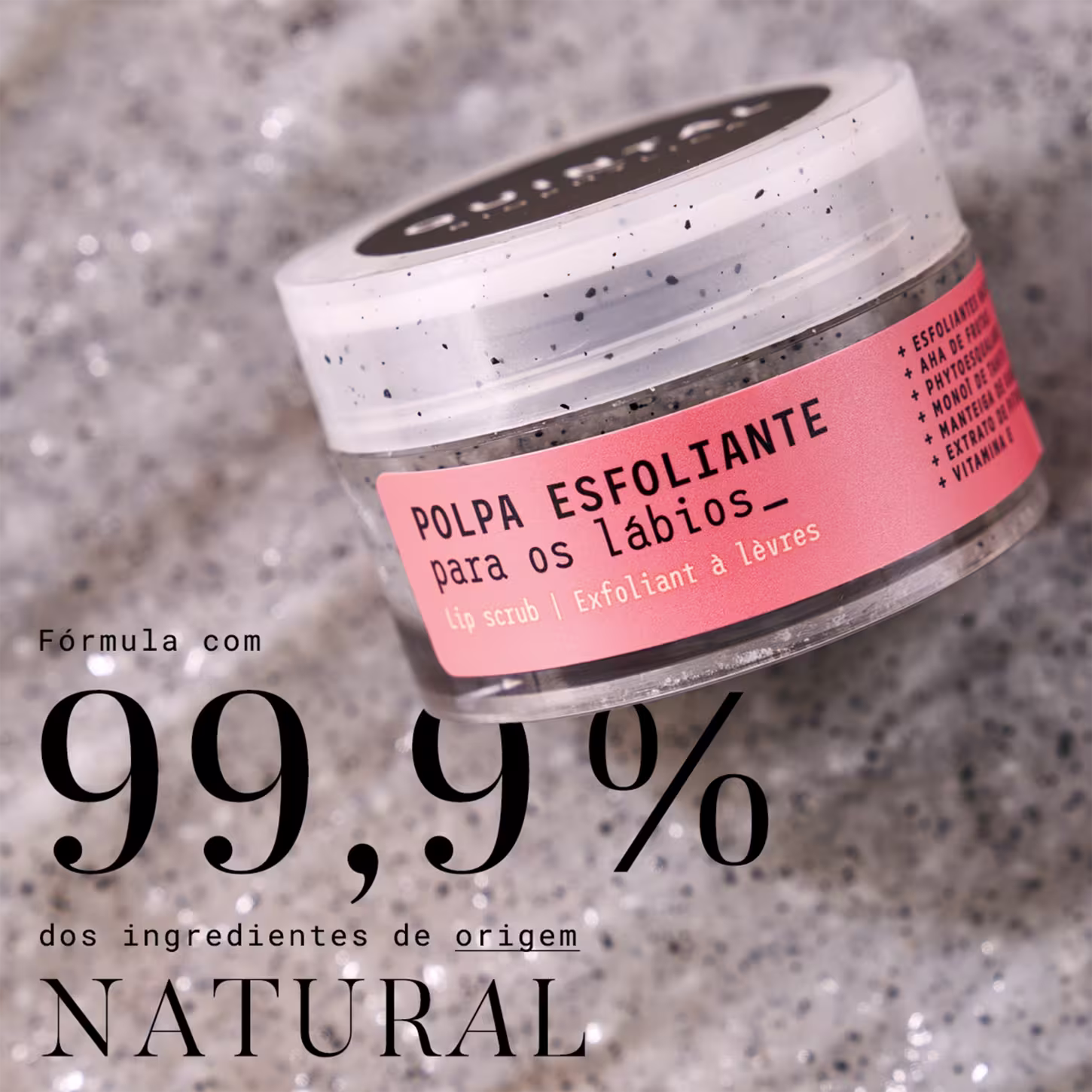 Esfoliante labial. O Quintal Dermocosméticos Polpa Esfoliante para Lábios confere mais maciez e suavidade aos lábios, diminuindo a aparência das “pelinhas" e "rachaduras”. Forma um filme hidratante nos lábios que realça a cor natural, além de melhorar as características gerais do relevo cutâneo e proporcionar um peeling suave por meio dos Alfa Hidroxiácidos (AHAs), fazendo uma esfoliação físico-química com ativos de propriedade cicatrizante, antioxidante e suavizante.