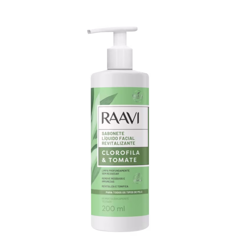 O Sabonete Líquido Facial Raavi Clorofila & Tomate possui vitaminas A, C e do complexo B, combinados com Extrato de Clorofila, Extrato de Tomate e Natuplex Citrus, que ajudam a tonificar e hidratar a pele.