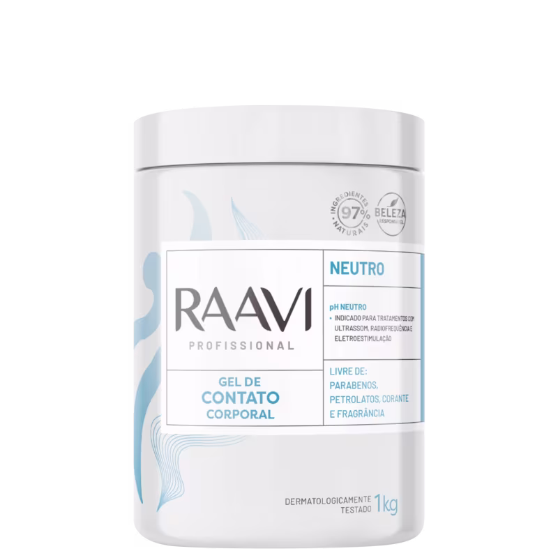 Gel de contato corporal. Raavi Cosméticos Neutro foi desenvolvido para atender profissionais que utilizam gel para acoplagem de equipamentos, podendo ser usado em todos os tipos de massagem. É recomendado para aqueles que não querem usar ativos ou para profissionais que desejam acrescentar óleos essenciais e ativos de sua preferência.