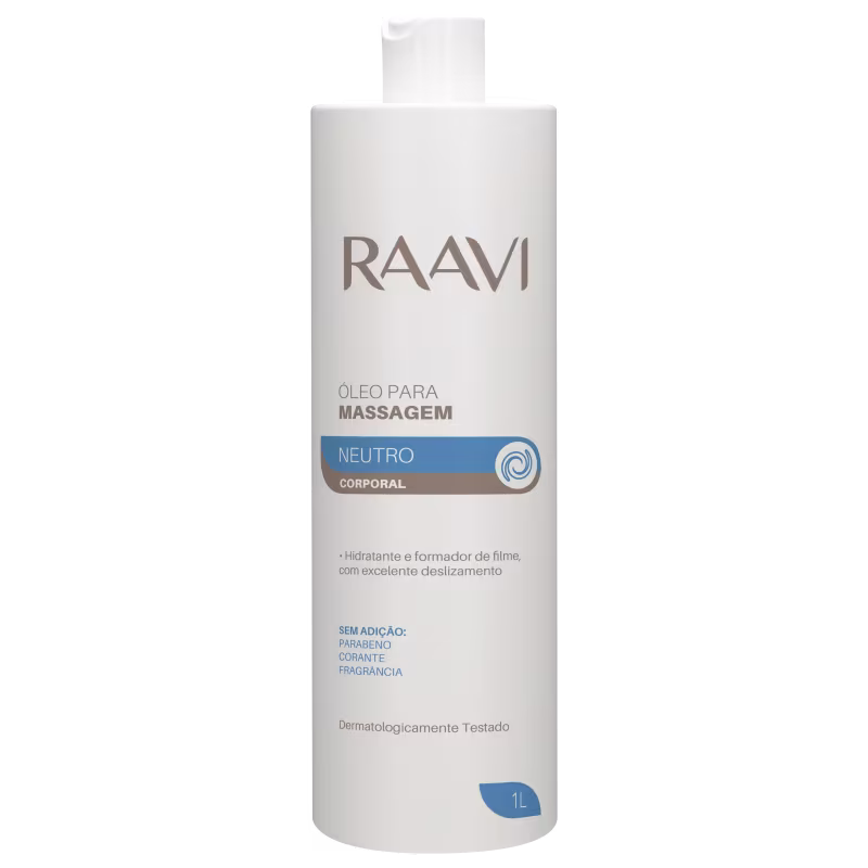 Óleo de massagem corporal. Raavi Cosméticos Neutro promove maciez e auxilia a elasticidade da pele, facilitando manobras de massagem de diferentes técnicas.