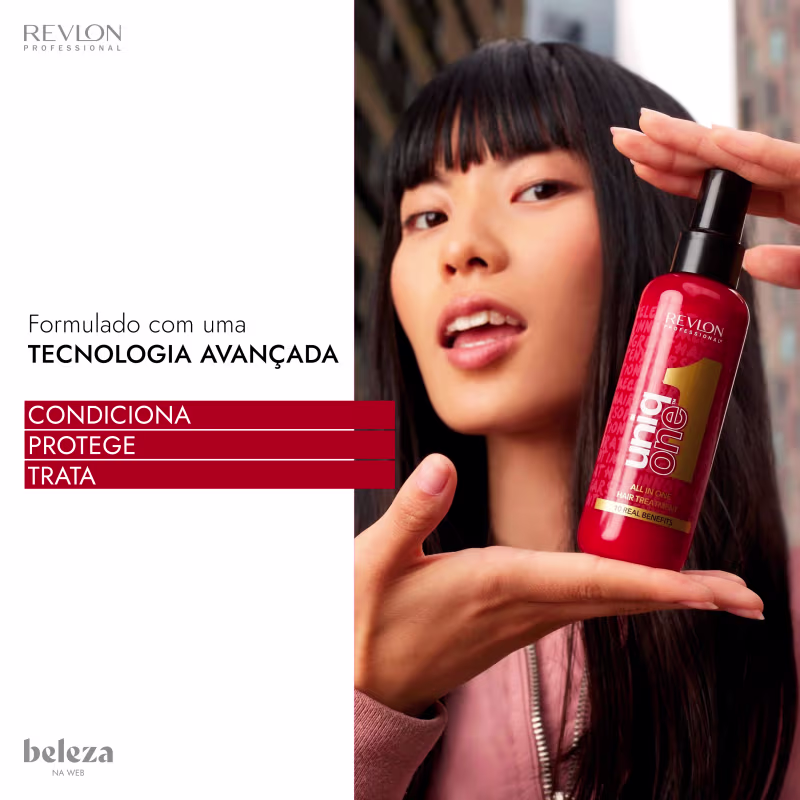O Leave-in Revlon Uniq One réune tudo que você precisa em um único produto para tratar os seus cabelos. Uma vez em ação, este Leave-in Revlon oferece: proteção térmica, solar e contra o desbotamento da cor, controle do frizz e do volume, repara os fios danificados, condiciona, desembaraça, facilita o uso da escova e da prancha, e previne as pontas duplas.