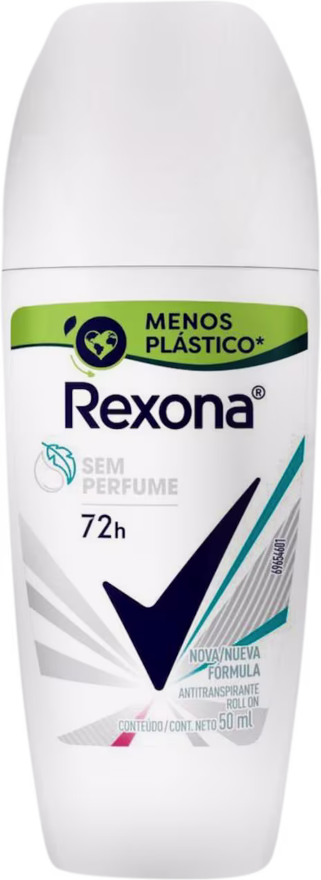 Desodorante roll on unissex. Rexona Antitranspirante Sem Perfume proporciona 72 horas de proteção contra a transpiração e o mau odor