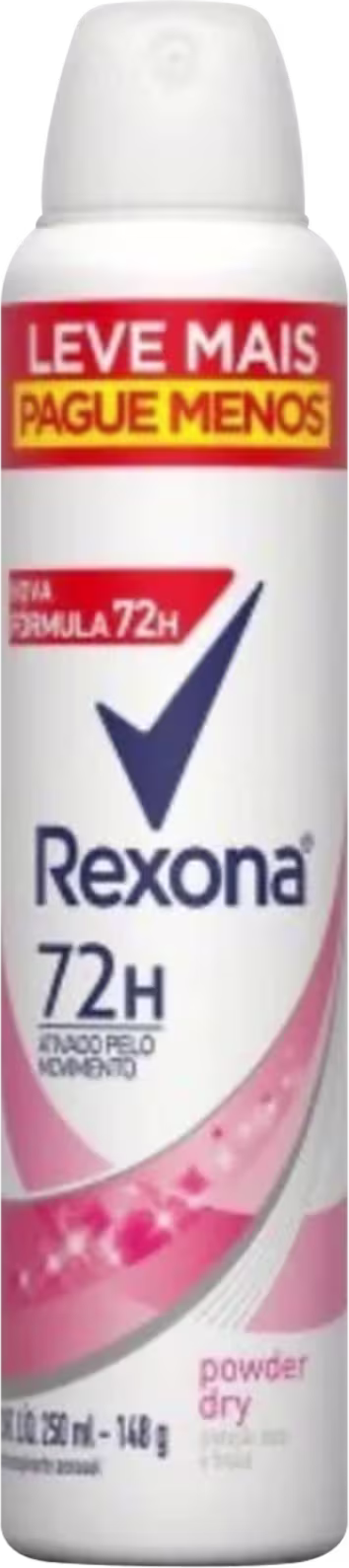 Desodorante aerosol. Rexona Powder Dry 72h promove 72 horas de proteção contra o suor e o mau odor.