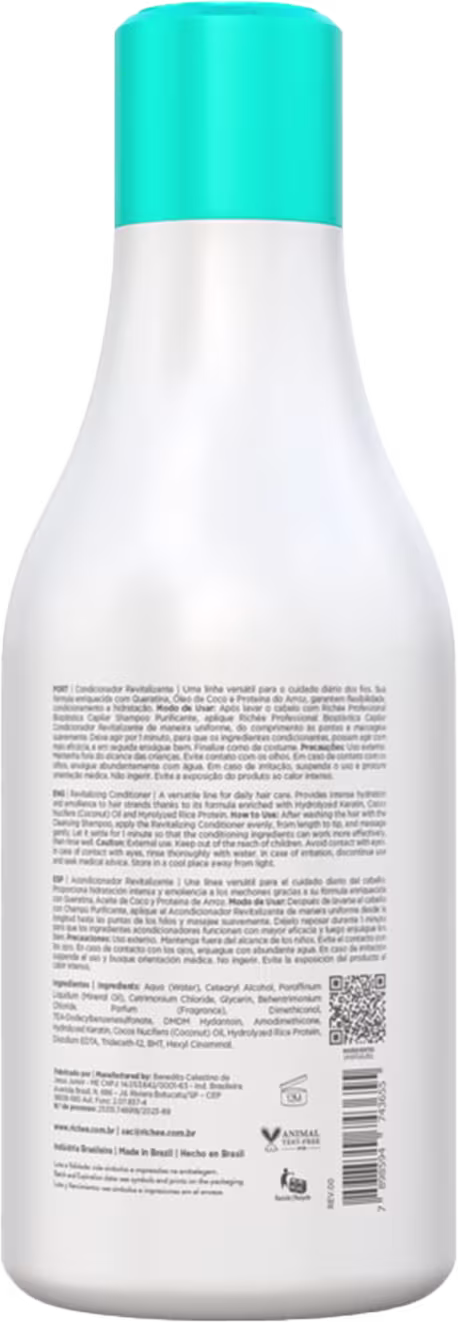 O Condicionador Revitalizante Richée Professional AB Bioplástica apresenta fórmula enriquecida com uma poderosa combinação de ingredientes naturais - queratina, óleo de coco e proteína do arroz, que ajuda a restaurar a elasticidade natural, devolve a suavidade e o toque sedoso, além de manter a hidratação dos fios por muito mais tempo.