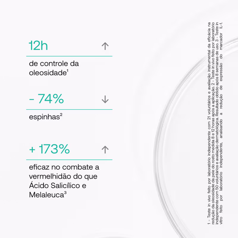 - Sem ácidos abrasivos na fórmula, reduz a vermelhidão e promove ação dermocalmante 173% superior a produtos com Ácido Salicílico e Melaleuca, combinação comum em produtos antioleosidade.³