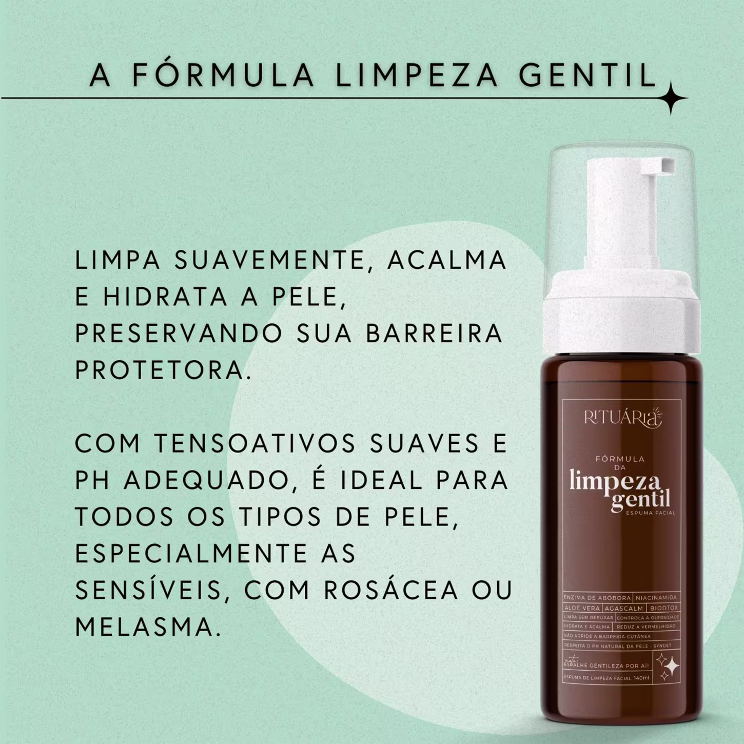 A Fórmula Limpeza Gentil Rituária é indicada para todos os tipos de pele, especialmente aquelas que necessitam de uma limpeza gentil, como melasma, rosácea, acne, dermatite, pele sensível ou sensibilizada, e psoríase.