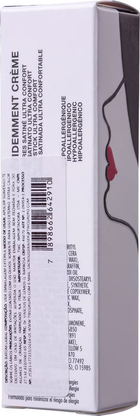 O Batom Rouge Évidemment Crème Rouge Baiser Paris traz uma mistura de óleos vegetais que suavizam e proporcionam volume aos lábios. Sua fórmula rica é incrivelmente pigmentada, hidratante e deixa um brilho sofisticado no visual.
