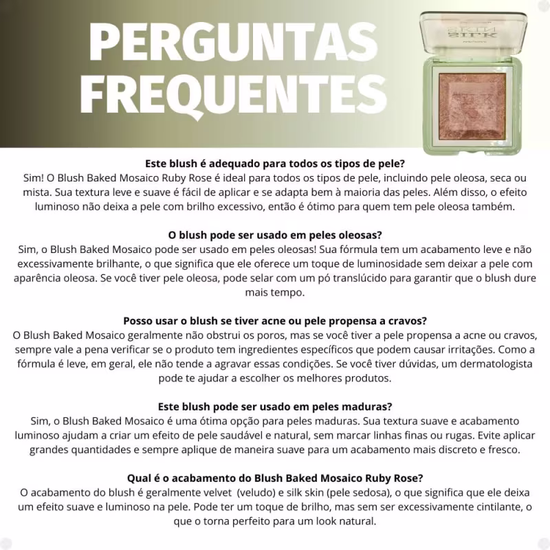 O Blush em Pó Ruby Rose Silk Skin Baked Mosaico Marble Bloom é a definição de sofisticação e leveza em um único produto. Graças à sua tecnologia baked (assada), ele apresenta uma textura ultrafina e sedosa que se funde à pele, entregando um acabamento impecável e um efeito luminoso que parece vir de dentro para fora.