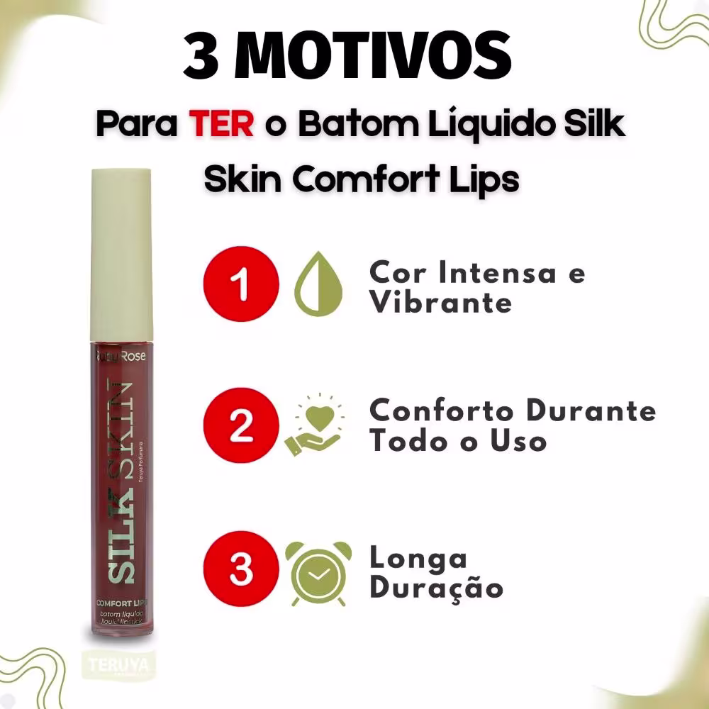O Batom Líquido Ruby Rose Silk Skin Comfort Lips traz o equilíbrio ideal entre uma cor intensa e um conforto excepcional, entregando um acabamento sedoso que desliza suavemente sobre os lábios. Sua fórmula de alta performance é enriquecida com ingredientes hidratantes e nutritivos que mantêm a aparência saudável da boca, evitando o ressecamento comum em produtos de longa duração e proporcionando um visual elegante e natural.