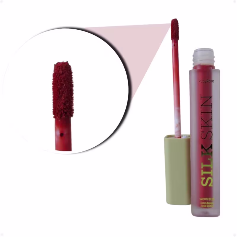 Batom líquido. Ruby Rose Silk Skin Smooth Blur possui textura aveludada e efeito blur que suaviza linhas, proporcionando um acabamento sedoso.