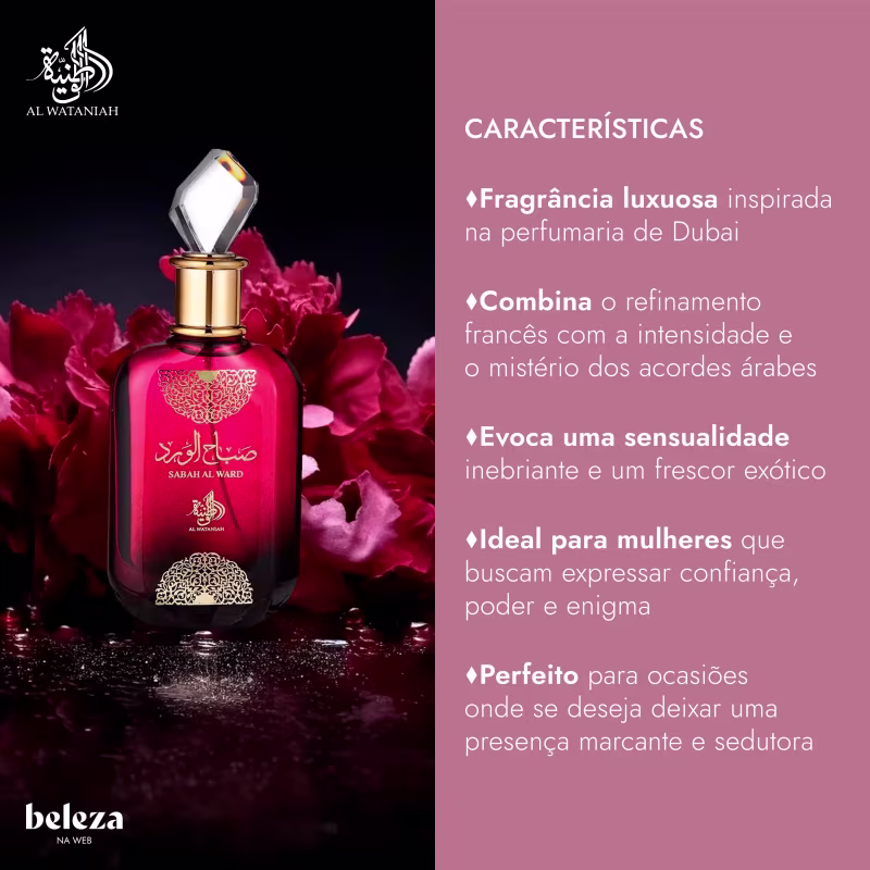 Sabah Al Ward é o envolvente perfume importado Al Wataniah feminino oriental floral. Uma fragrância que evoca o mistério profundo e a sensualidade inebriante, projetada para a mulher que abraça sua feminilidade com confiança e poder.