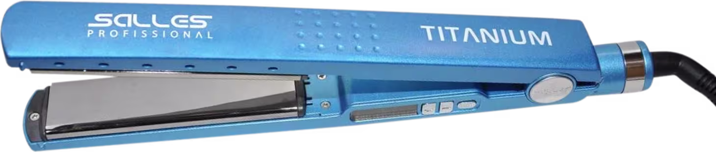 Chapinha bivolt de uso profissional. Salles Profissional Titanium Bivolt Azul alisa os fios com rapidez, sem deixar danos às fibras capilares.