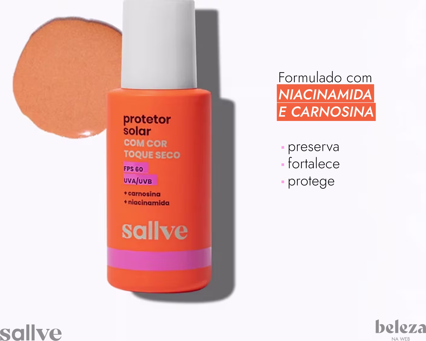O Protetor Solar com Cor Sallve FPS60 oferece multi defesa contra a radiação solar e os danos da luz azul, infravermelho e poluição. Além disso, proporciona uniformidade ao tom da pele. Com Carnosina na composição, tem ação antioxidante e ajuda a preservar o colágeno da pele. Enquanto isso, a Niacinamida contribui para o controle de oleosidade ao longo do dia, reduzindo o brilho sem ressecar. Ele também é compatível com maquiagem, pois não esfarela, não escorre e não arde os olhos.