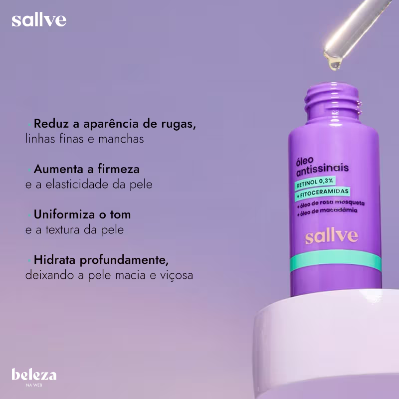 O Óleo Antissinais Sallve reduz a aparência de rugas, linhas finas e marcas. Ele aumenta a elasticidade e a firmeza da pele, estimula a síntese de Colágeno, uniformiza tom e textura. Além disso, também hidrata a pele, deixando um acabamento macio e viçoso.
