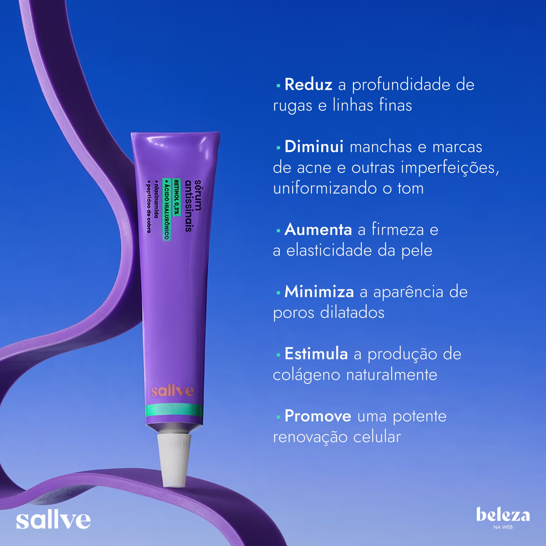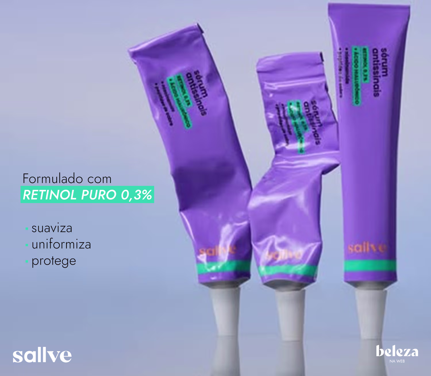 Sérum Antissinais Sallve Retinol Puro 0.3%, tratamento noturno que promove renovação celular potente. Melhores produtos Sallve na BLZ. Ver mais ❯