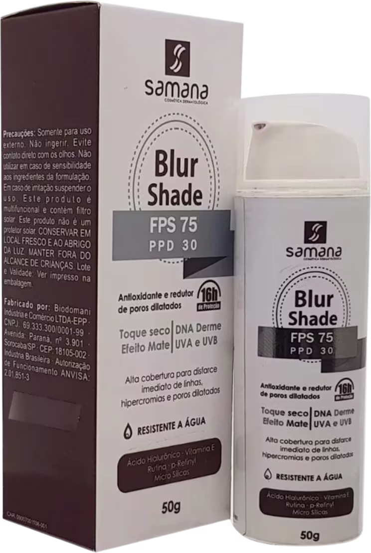 Não sei o CEPProtetor solar com cor. Samana Blur Shade FPS75 promove ampla proteção UVA e UVB por 16 horas e oferece alta cobertura a pele.