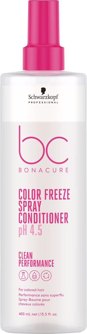 Schwarzkopf Professional BC Bonacure Clean Performance Color Freeze Spray Conditioner é um condicionador em spray leve e sem enxágue com proteção térmica, especialmente formulado para cabelos tingidos. Ideal para desembaraçar instantaneamente e melhorar a penteabilidade do cabelo, proteger os fios e garantir cor vibrante com brilho intenso. A linha Color Freeze para cabelos coloridos com pH 4.5 reequilibra a estrutura do cabelo para um nível de pH ideal e protege a cor do cabelo, evitando o desbotamento.