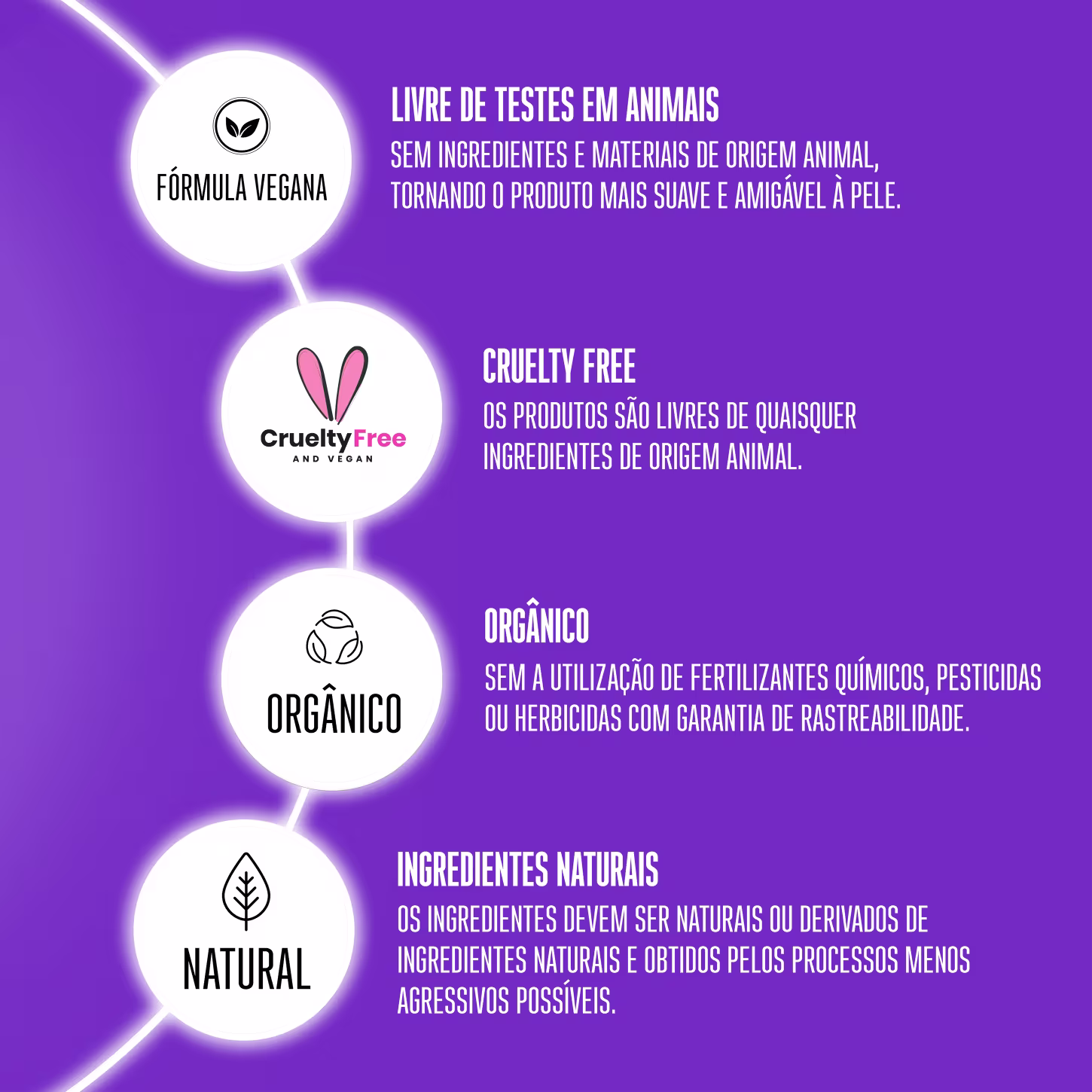 Produto vegano, livre de Sulfatos, Silicones e Parabenos.
