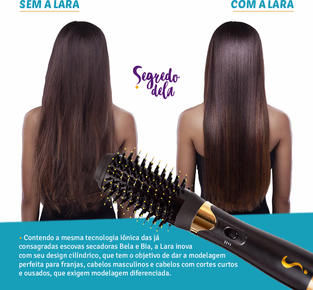 A Escova Secadora Segredo Dela Lara inova com seu design cilíndrico, que tem o objetivo de dar a modelagem perfeita para franjas, cabelos masculinos e cabelos com cortes curtos e ousados, que exigem modelagem diferenciada. Para ajudar a preservar a saúde dos fios, o revestimento da Lara é todo em cerâmica, o que impede picos de temperatura e suas cerdas possuem a rigidez ideal: nem tão firmes, nem tão macias, perfeitas para o cabelo brasileiro!