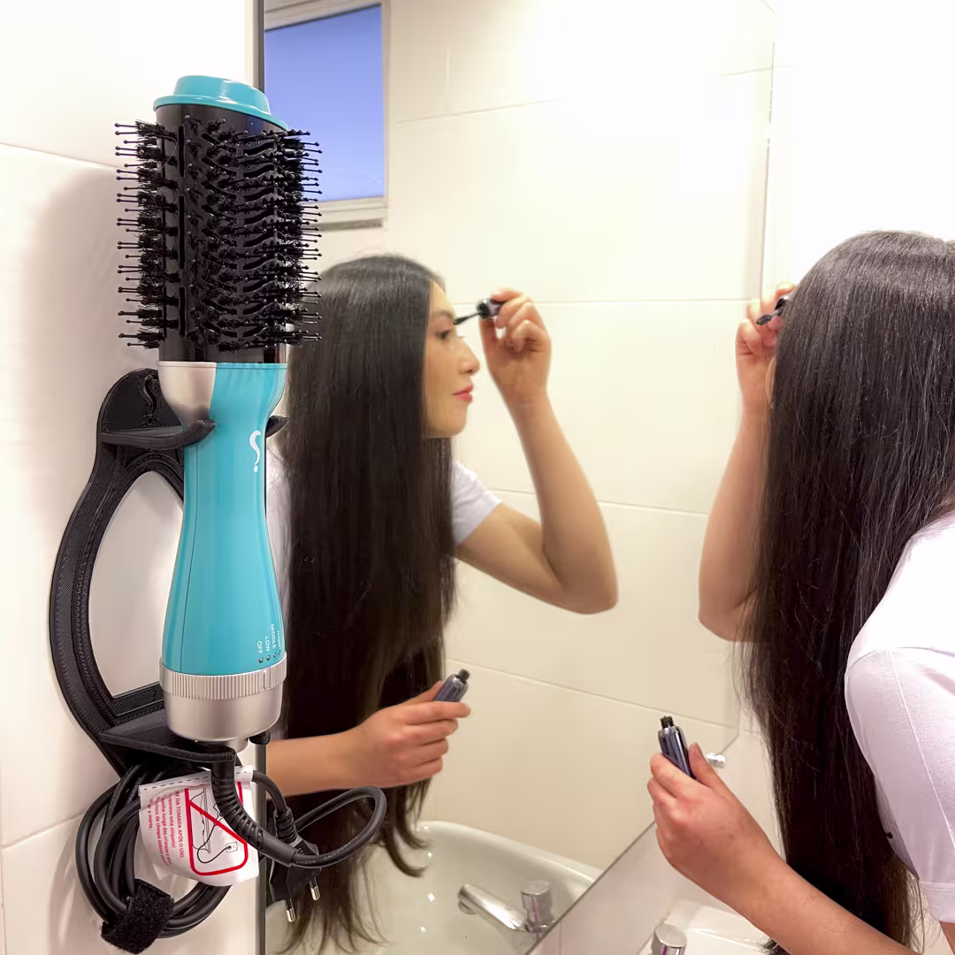 O Suporte para escovas secadoras Segredo Dela Tati Super Prática prolongando a vida útil da sua escova secadora impedindo que as cerdas sejam comprimidas e que não fiquem danificadas após o uso, enquanto quentes. Conta com um lugar específico para armazenar os fios, evitando que eles fiquem emaranhados. Ela também oferece praticidade e mantém a escova pronta para ser utilizada, podendo ser deixada em superfícies planas ou até mesmo ser fixada na parede.