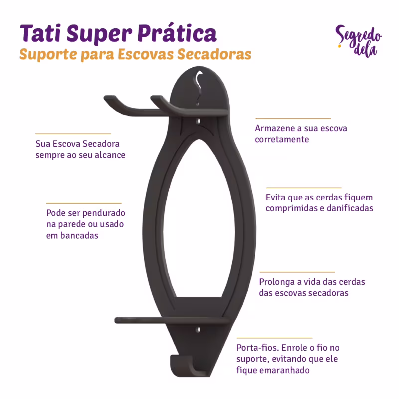Suporte para escovas secadoras. Segredo Dela Tati Super Prática foi desenvolvido para organizar e proteger a sua escova de danos futuros nas cerdas. Serve para qualquer modelo de escova secadora que possua o mesmo tamanho que as escovas Bela e Bia, da Segredo Dela.
