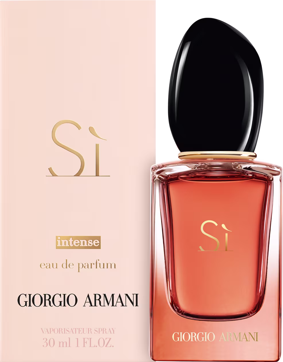 Sì Intense é um perfume feminino âmbar floral Armani. Combina néctar de groselha, rosa turca, davana, patchouli e resina de benjoim.