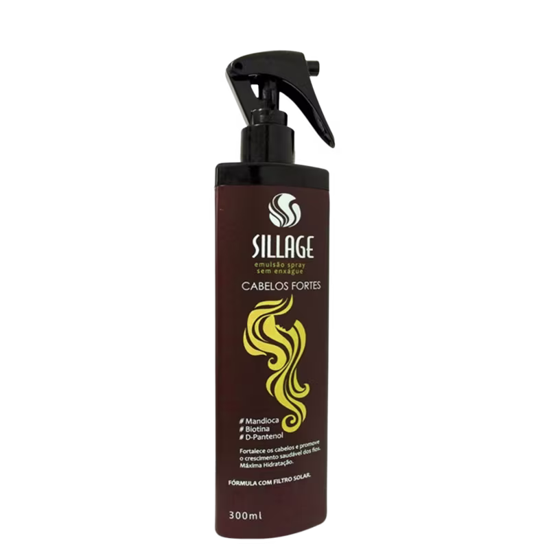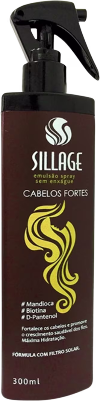 Emulsão spray, sem enxague. Sillage Cabelos Fortes protege a estrutura dos fios, previne a queda e restaura o bulbo capilar.