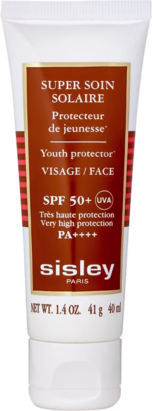 Sisley Super Soin Solaire Protecteur de Jeunesse Visage FPS 50 previne dos efeitos do fotoenvelhecimento, como rugas, manchas escuras, desidratação e perda de firmeza, e permite com que ela se recupere com mais facilidade dos danos externos. Possui textura em creme fluído e suave, que confere maciez e não esbranquiça a pele. Sua fórmula é à prova d’a água. Tudo isso aliado a uma fragrância luxuosa devido aos óleos essenciais de sábio e manjerona.