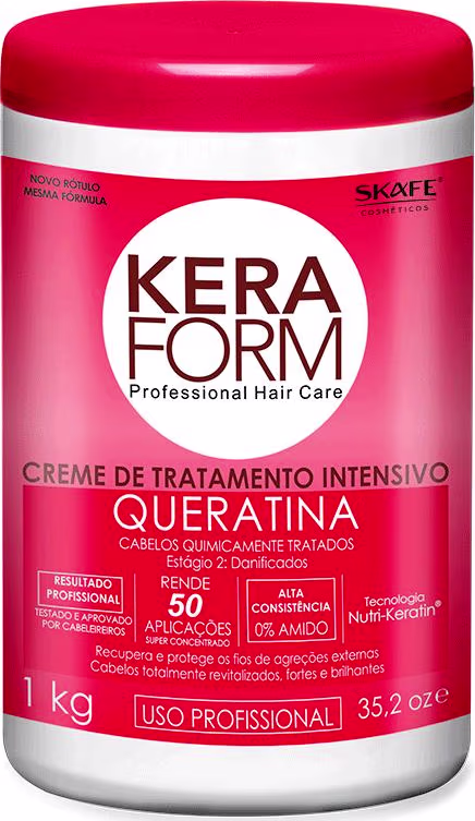Creme de tratamento para cabelos quimicamente tratados. Skafe Keraform Queratina Cabelos com Química recupera os fios e protege das agressões diárias. Ele age diretamente na fibra capilar, regenerando as áreas danificadas e devolvendo a maciez, brilho, sedosidade e saúde para as suas madeixas.