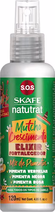 Tônico capilar para crescimento dos fios. Skafe Natutrat S.O.S. Mutcho Crescimento confere equilíbrio e força, evitando o envelhecimento precoce. Sua fórmula poderosa à base de um mix de Pimentas, deixa os fios altamente condicionados, além de acelerar seu crescimento saudável e reparar as células.