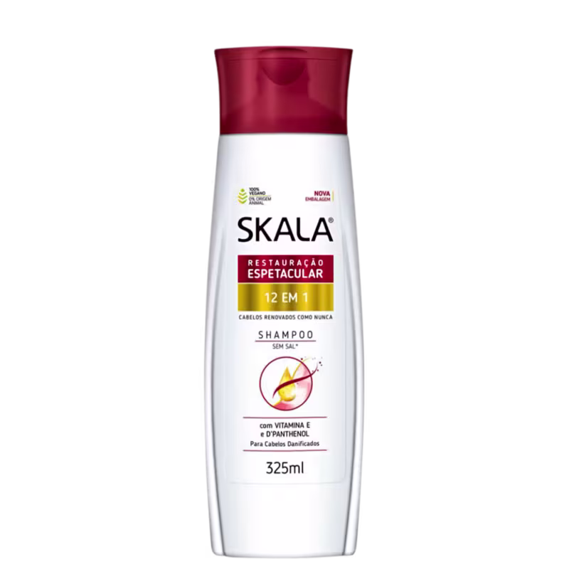 Shampoo para cabelos danificados. Skala 12 em 1 restaura completamente as fibras capilares, com eficiência e saúde.