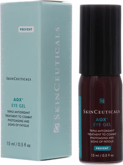 Gel para a área dos olhos. SkinCeuticals AOX Eye Gel oferece tripla proteção antioxidante, além de diminuir olheiras, rugas, linhas finas, bolsas e inchaço. Assim, revitaliza o olhar para que deixar uma aparência jovem e descansada.