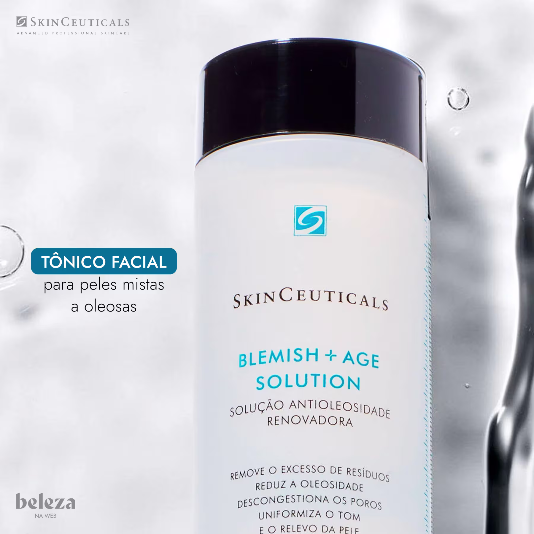 O Tônico Facial SkinCeuticals Blemish + Age Solution complementa a limpeza diária do rosto e também promove a renovação da pele.