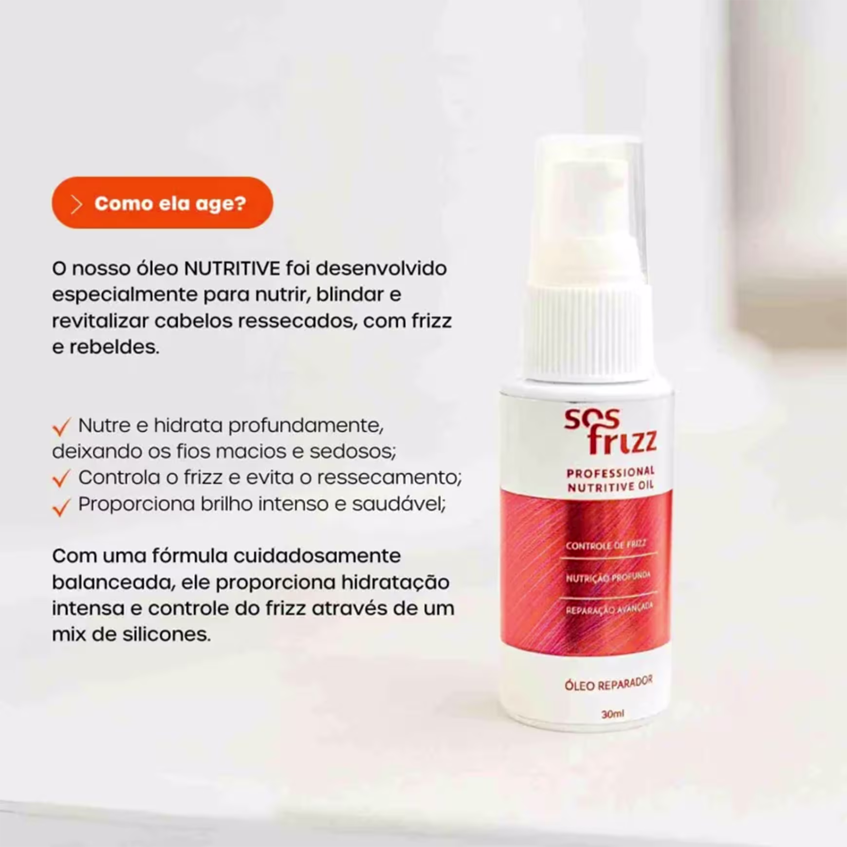 Óleo reparador para cabelos com frizz. Sos Frizz Professional Nutritive Oil nutre e hidrata profundamente, através de um mix de silicones.